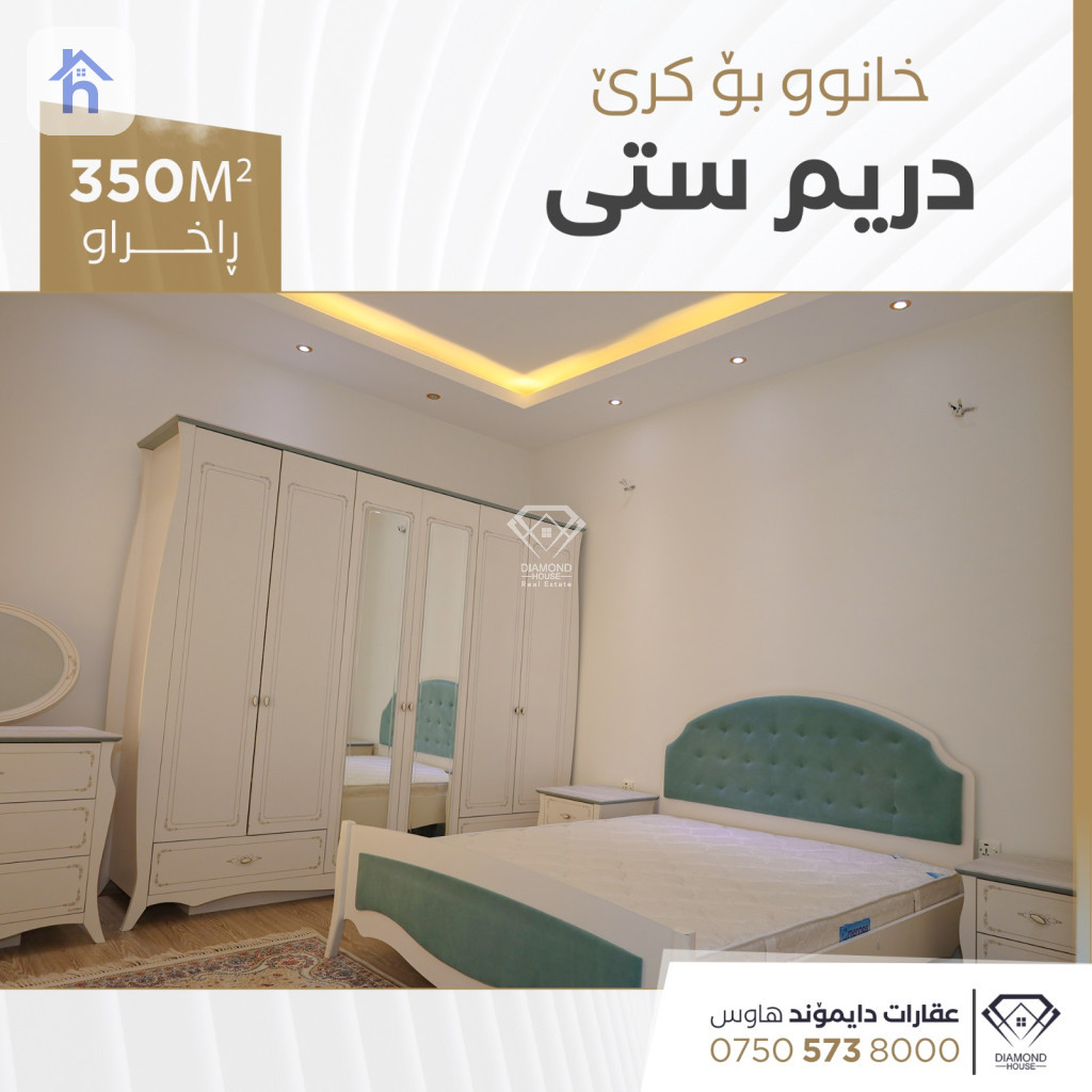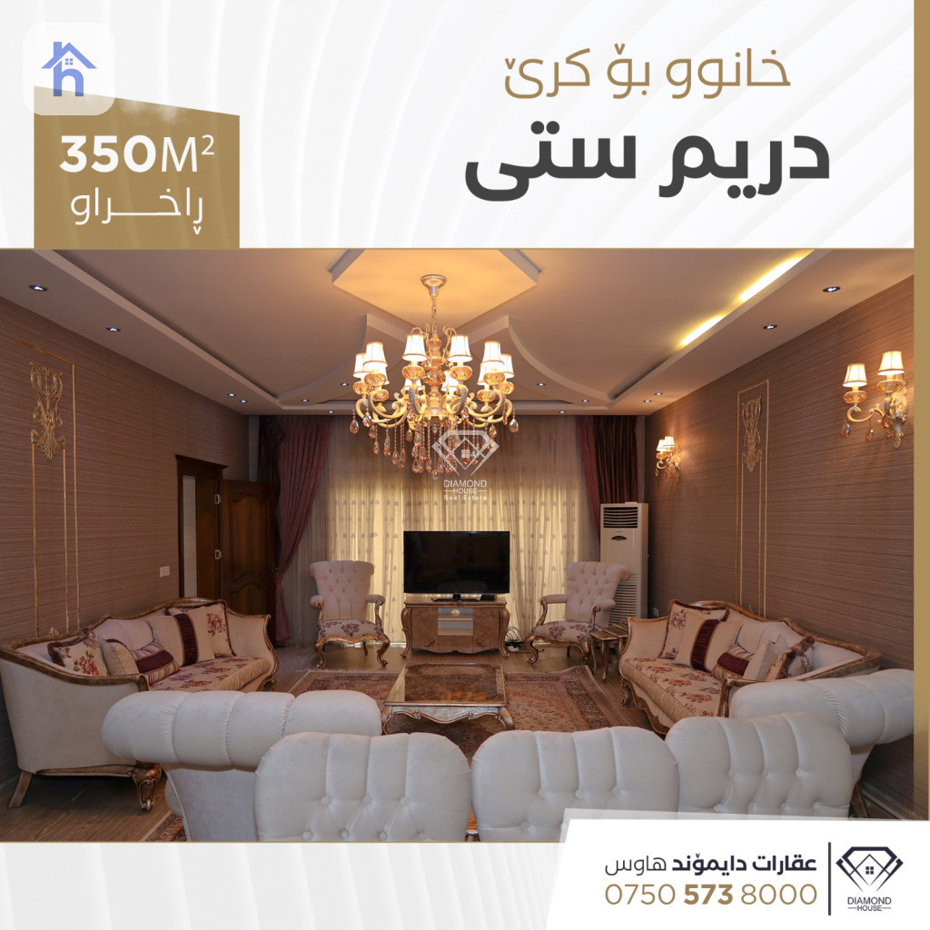 منزل مؤثث للبيع، في أربيل، دريم ستي، المساحة 350 متر مربع، بسعر 110 دفتر (1,100,000$) (قابل للتفاوض). تتكون من: - 6 غرف نوم - 2 مطبخ - 1 غرفة المعيشة - 1 صالة - 5 حمام - 1 غرفة الطعام - 1 غرفة الغسيل - طابق : 2