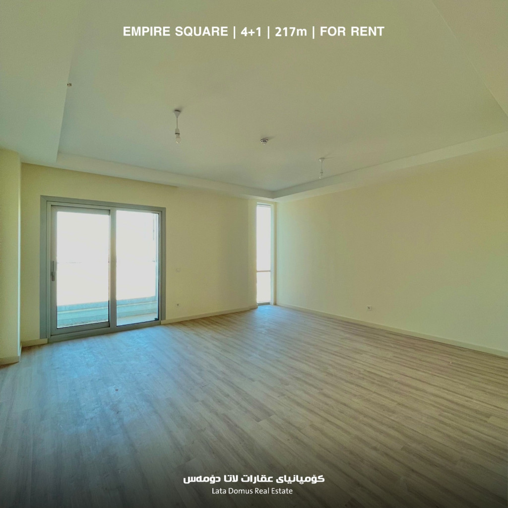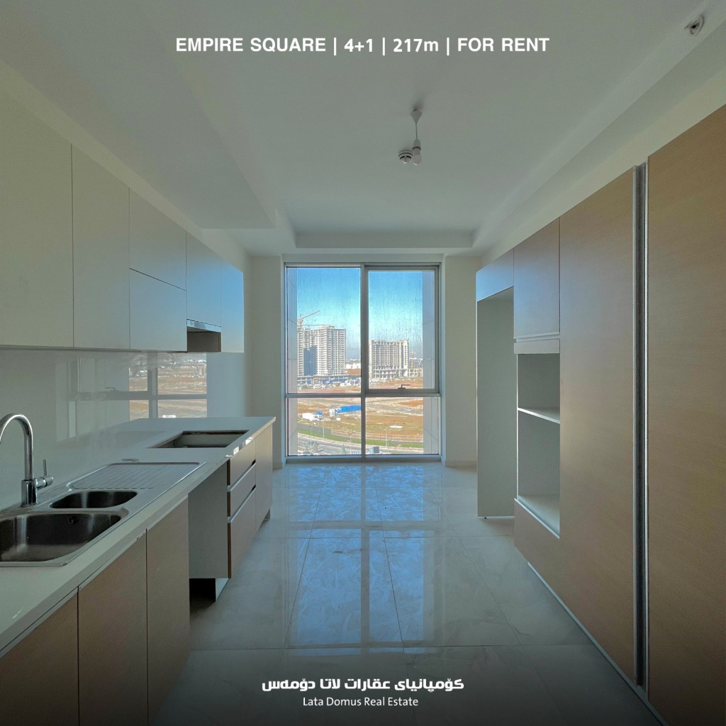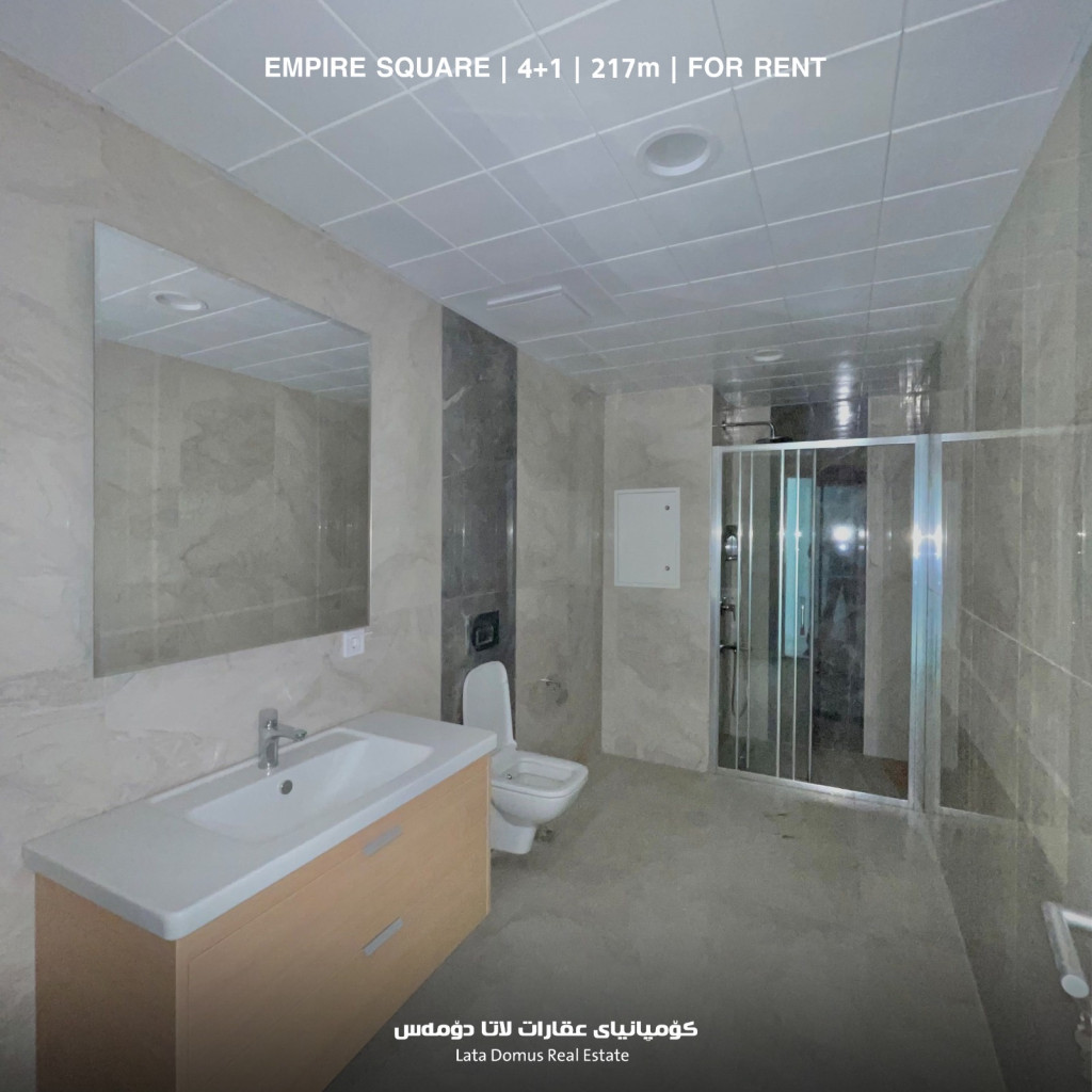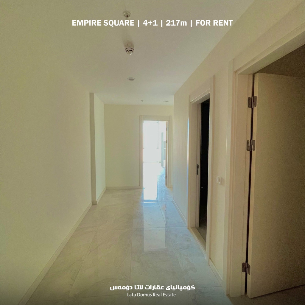 شقة للإيجار، في أربيل، أمباير سكوير، المساحة 217 متر مربع، بسعر 11 ورقة/شهريا (1,100$). تتكون من: - 4 غرف نوم - 1 مطبخ - 1 صالة - 3 حمام - طابق : 9